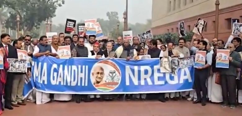 The Indian National Developmental Inclusive Alliance constituents’ Members of Parliament hailing from various non BJP opposition parties led by Sonia Gandhi and Congress chief Mallikarjun Kharge boycotted both the houses of parliament and held a protest demonstrations holding a huge banner of Mahatma Gandhi REGA and good number of banners opposing the bills introduced by the government in parliament to change the name of MNREGA etc.