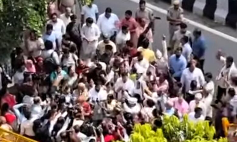 Hundreds of protestors hailing from opposition parties and individual social groups today protested outside the residential appartment Riverview where Lives the seventy ine year old Advocate Rakesh Kishore who attempted to throw shoes on the chief justice of India in the court while the CJI was on the chair hearing the petition. The protestors were raising so gans against him as well those behind this ugly act demanding stringent legal action against the earring advocate.