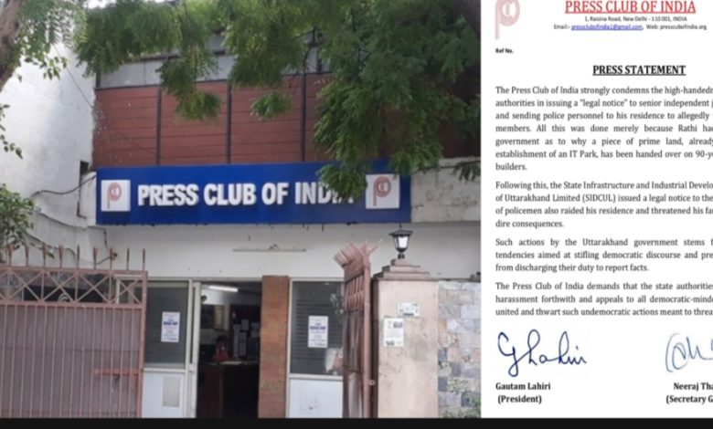 PRESS CLUB OF INDIA AND PRESS ASSOCIATION ( BODY OF ACCREDITED JOURNALISTS) STRONGLY CONDEMN the high-handedness of Uttarakhand authorities in issuing a “legal notice” to senior independent journalist