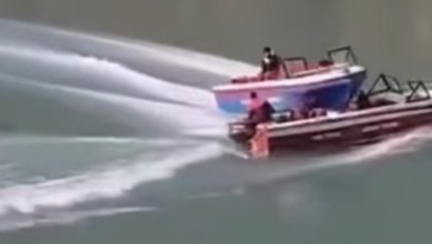 A speeding boat which was to collide with another in Alaknanda river fortunately over crossed it in extreme speed with a driver falling in the river saved afterwards. Tragedy averted