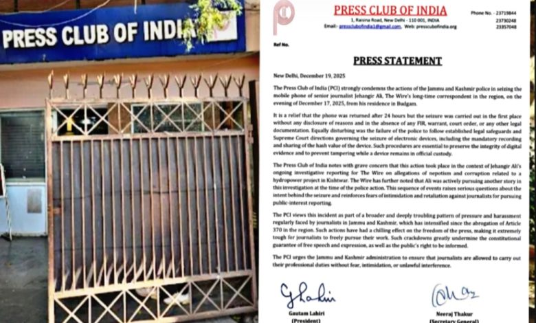 The Press Club of India (PCI) strongly condemned the actions of the Jammu and Kashmir police in seizing the mobile phone of senior journalist Jehangir Ali, The Wire’s long-time correspondent in the region, on the evening of December 17, 2025, from his residence in Budgam.